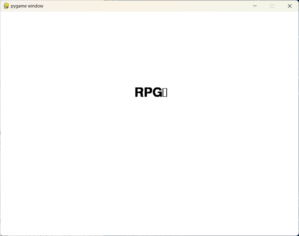 import pygame pygame.init() screen = pygame.display.set_mode((800,600)) screen.fill((255,255,255)) running = True while running: font = pygame.font.SysFont(None,50) #追加 text = font.render("RPG仮",True,(0,0,0)) #追加 screen.blit(text,(360,200)) #追加 for key in pygame.event.get(): if key.type == pygame.QUIT: running = False pygame.display.update()
