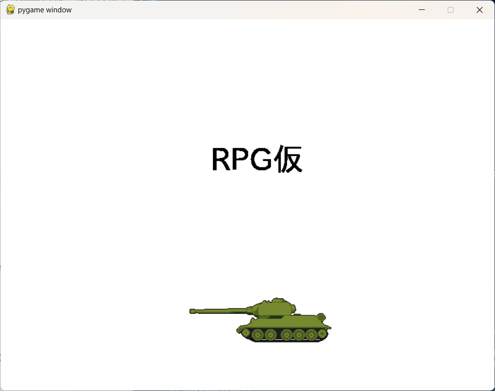 import pygame pygame.init() screen = pygame.display.set_mode((800,600)) screen.fill((255,255,255)) img = pygame.image.load("player.png") #追加 x = 300 ; y = 450 #追加 running = True while running: font_path = "ipaexg.ttf" font = pygame.font.Font(font_path,50) text = font.render("RPG仮",True,(0,0,0)) screen.blit(text,(340,200)) screen.blit(img,(x,y)) #追加 for key in pygame.event.get(): if key.type == pygame.QUIT: running = False pygame.display.update()